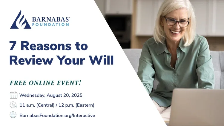 Invite your supporters to attend this free, live-streamed event with Barnabas Foundation’s Lindsay Canan, J.D. Lindsay will discuss some of the most common reasons that warrant an update to our estate plans.