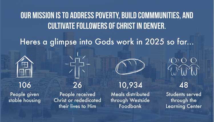Each number represents a story of hope, restoration, and new beginnings. Because of your continued prayers, generosity, and partnership, people across Denver are finding housing, meals, community, and the love of Christ.